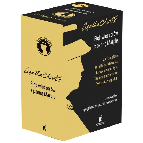 Pakiet 5 książek Agaty Christie w kartonowym pudełku.Zatrute pióroDo Lymstock przyjeżdża na rekonwalescencję Jerry Burton, lotnik dochodzący do siebie po przeżytej katastrofie, wraz z siostrą Joanną. Liczą na spokój i ciszę – a tymczasem wkrótce po ich przybyciu miasteczkiem wstrząsa tragiczna śmierć pani Symmington: do odebrania sobie życia popchnął ją ohydny anonim. Wkrótce okazuje się, że tego typu liściki otrzymała połowa mieszkańców... ale nikt nie chce się do tego przyznać. Czy Jerry i Joanna odkryją, kto z mieszkańców opluwa śmiertelnym jadem sąsiadów?Karaibska tajemnicaPanna Marple, dzięki hojności swego kochającego siostrzeńca Raymonda, wypoczywa w luksusowym pensjonacie na jednej z wysp karaibskich. Tak egzotyczne otoczenie bynajmniej nie oszałamia starszej pani: gdy zostaje zamordowany emerytowany pułkownik, stary, nieszkodliwy nudziarz, panna Marple rozpoczyna prywatne śledztwo, swoim zwyczajem porównując ludzi i sytuacje do znanych sobie osób i wydarzeń z sennego miasteczka St Mary Mead... I jak zwykle rozwiązuje niezwykle zagmatwaną zagadkę.Kieszeń pełna żytaKiedy właściciel dużej londyńskiej firmy umiera nieoczekiwanie, otruty we własnym biurze, policja odkrywa aż nadmiar podejrzanych. Młoda, atrakcyjna żona z kochankiem; syn żywiący urazę do ojca o sposób prowadzenia interesów; sfrustrowana córka, której ojciec nie dopuścił do ślubu z ukochanym. Wydawać by się mogło, że śledztwo doprowadziło do odkrycia winnego, kiedy nowa zbrodnia obala dotychczasowe koncepcje. Na szczęście panna Marple ma pomysł, który pozwoli naprowadzić policję na właściwy trop.Uśpione morderstwoGwenda Reed wraca do kraju po latach spędzonych w Nowej Zelandii. Kupuje dom w Dillmouth, ale od samego początku odzywają się demony przeszłości. Wnętrze nowego domu wydaje jej się dziwnie znajome. W dodatku po kilku dniach zaczyna ją dręczyć wizja kobiety duszonej przez mężczyznę. Wkrótce dzięki pomocy panny Jane Marple Gwenda odkrywa, dlaczego dom wydaje jej się tak bardzo znajomy: mieszkała w nim przez krótki czas przed wyjazdem do Nowej Zelandii. Również wizja umierającej kobiety nie jest jedynie przywidzeniem, lecz wydarzeniem zapamiętanym z dzieciństwa. O zbrodnię oskarżono wówczas jej ojca. Jednak dziewczyna jest przekonana, że to nie swojego ojca widziała kilkanaście lat temu, duszącego kobietę. Wraz z panną Marple postanawiają wykryć prawdziwego mordercę.Trzynaście zagadekOto grupa znajomych panny Jane Marple. Siedzą wokół komina, rozmawiają, i nagle ktoś proponuje, by każda z obecnych osób opowiedziała historię, której rozwiązanie jej tylko jest wiadome. Reszta zaś postara się odgadnąć prawdę. I kto za każdym razem wygrywa? Siwowłosa staruszka, pozornie zajęta jedynie dzierganiem na drutach śpioszków i skarpetek.