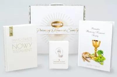 Zestawy komunijne przygotowane specjalnie na uroczystość I Komunii świętej. Chrześcijańska pamiątka tego wyjątkowego wydarzenia w życiu dziecka Pięknie wydane, wartościowe książki wraz z modlitewnikiem przypomną niezwykłe chwile związane z uroczystością Eleganckie opakowanie stanowiące gotowy prezent W zestawie znajdują się: Pismo święte Nowy Testament - 140x205 mm, 516 stron, oprawa twarda Pamiątka Pierwszej Komunii świętej - 145x205 mm, 24 strony, oprawa twarda, kolorowe zdjęcia Kocham Cię, Jezu. Modlitewnik - 80x117 mm, 304 strony, oprawa twarda