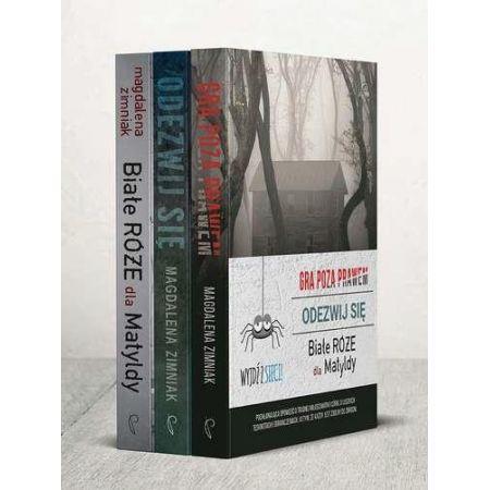 Thrillery psychologiczne łączące duży ładunek emocjonalny z nagłymi zwrotami akcji. Historie, od których trudno się oderwać. A potem trudno zapomnieć.Gra poza prawemDorota ma dwadzieścia lat. Nigdy nie opuściła domu, nie ma dostępu do telefonu ani internetu. Ola jest młodą bibliotekarką, wychowanką domu dziecka. Zmaga się z toksyczną przeszłością i kompleksami. Kiedy ich drogi się krzyżują, dochodzi do zbrodni.Odezwij sięZaginięcie dwójki dzieci spada na z pozoru idealne małżeństwo Mielczarków jak grom z jasnego nieba. Ucieczka? Rodzice są pewni, że porwanie. Policja natomiast sugeruje, że Ada, od lat zmagająca się z nerwicą natręctw, mogła zrealizować „fantazje” i skrzywdzić brata.Białe róże dla MatyldyPo nagłej śmierci rodziców Beata próbuje odzyskać spokój. Nie jest to łatwe, ponieważ krótko po pogrzebie pojawiają się śledczy, podając w wątpliwość tezę o wypadku.