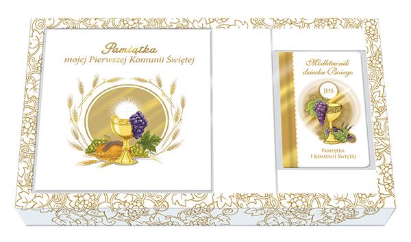 Pamiątka mojej Pierwszej Komunii Świętej jest bogato ilustrowanym albumikiem, w którym zapisać można najważniejsze wydarzenia oraz umieścić fotografie z uroczystości pierwszokomunijnej. Modlitewnik dziecka Bożego w złoconej oprawie zawiera wszystkie ważne modlitwy, mały katechizm, popularne pieśni oraz informacje dotyczące sakramentów świętych.