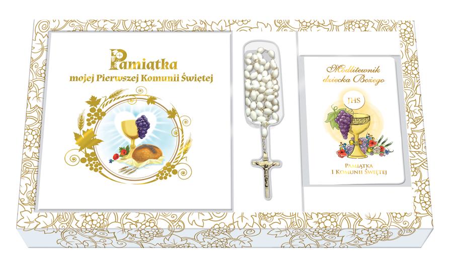 W zestawie znajdują się: Pamiątka mojej Pierwszej Komunii Świętej, Modlitewnik dziecka Bożego. Kocham Ciebie, Jezu, Różaniec, Torba prezentowa.