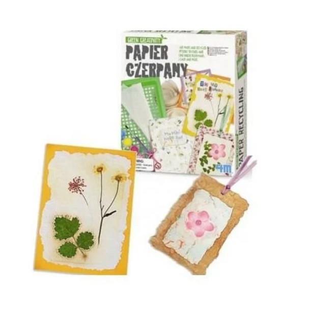 zestaw umożliwia samodzielne skonstruowanie zabawek uczy jak z makulatury zrobić własnoręcznie artystyczny i niezwykle piękny papier czerpany rozwija wyobraźnię i zdolności manualne zestaw zawiera: plastikowa taca siatkowa, plastikowe arkusze, arkusze papieru, włóczka, koperty, wstążka, dwustronna taśma klejąca, farby i pędzel, kwiatek z jedwabiu, koraliki dodatkowo potrzebne będą: plastikowa butelka (1,5 l), suche szmatki, gazeta, pojemnik na wodę (niedołączone do zestawu)Uwaga! Produkt nieodpowiednie dla dzieci w wieku poniżej 3 lat.