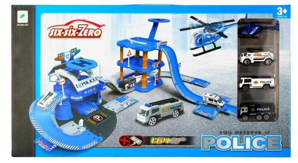 Zawartość zestawu: parking do samodzielnego montażu, trzy samochody, helikopter oraz dodatkowe akcesoria.