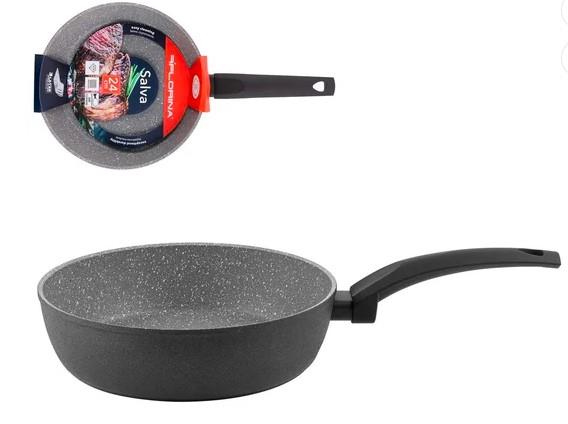 Patelnia wykonana z kutego na zimno aluminium jest odporna na działanie rdzy oraz odkształcenia. Pokryta 3-warstwową powłoką, dzięki której potrawa nie przywiera do dna i nie przypala się. Możliwość użytkowania na dowolnym typie kuchenki. Dane techniczne: Waga brutto (kg): 0.790 Średnica: 24 cm Kolor: Szary, Czarny Materiał: Aluminium Wysokość: 7 cm Szerokość: 24,5 cm Długość: 43,5 cm Uchwyt: Soft touch, Nienagrzewający się Rodzaj powłoki: Nieprzywieralna Opakowanie: Kolorowy kartonowy rękaw Atrybuty: Na kuchenkę elektryczną, Na gaz, Na indukcję, Na kuchenkę ceramiczną, Mycie ręczne Produkt może mieć uszkodzone opakowanie lub naruszoną plombę fabryczną opakowania. Uszkodzenia nie wpływają na funkcjonalność produktu.