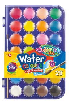 Farba akwarelowa duża pastylka 28 kol. Colorino Kids 67317PTR Aksamitne farby akwarelowe marki Colorino są zmywalne i nietoksyczne, a co za tym idzie w pełni bezpieczne dla użytkownika. Farby akwarelowe wodne do malowania na papierze. Do wyboru 28 soczystych i intensywnych kolorów. Wielkość tabletki 28 mm. Doskonale kryjące wodorozcieńczalne farby w 28 intensywnych kolorach. Dzięki aksamitnej konsystencji farby doskonale rozprowadzają się po malowanej powierzchni. Kolory można z łatwością mieszać, co pozwala na rozszerzanie dostępnej palety barw. Nietoksyczne. Posiadają niezbędne atesty i certyfikaty. nasycone kolory, zmywalne za pomocą wody nietoksyczne. Produkt może mieć uszkodzone opakowanie lub naruszoną plombę fabryczną opakowania. Uszkodzenia nie wpływaja na funkcjonalność produktu.