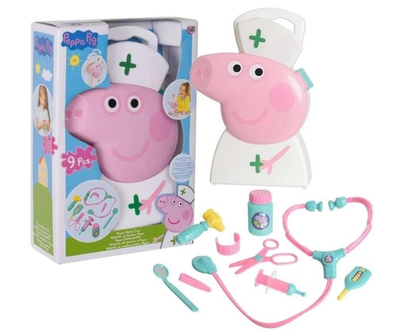 Pozwól maluchowi użyć swojej wyobraźni i pomóc pielęgniarce Peppie w jej własnym gabinecie medycznym Świnki Peppy. Wyposażona w niezbędny sprzęt pielęgniarski, będzie miała wszystkie narzędzia potrzebne do diagnozowania i leczenia wszystkich jej pacjentów. Wszystkie akcesoria są starannie spakowane w etui. Zestaw zawiera stetoskop, strzykawkę, termometr, otoskop, pęsetę, plastikowy plaster, buteleczkę z lekarstwami, nożyczki i lusterko.