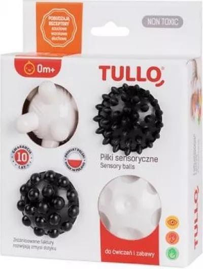 Zestaw czterech mikkich piłek sensorycznych przeznaczonych do ćwicze integracji sensorycznej oraz zabawy Każda piłka posiada inny rozmiar i inną faktur dziki czemu dostarcza różnych wraże czuciowych Piłeczki sensoryczne Tullo są polecane przez fizjoterapeutów do masażu niemowląt w celu rozluźnienia napicia miśniowego Czarno- białe zestawienie kolorystyczne idealnie stymuluje zmysł wzroku u niemowlaka który nie rozróżnia jeszcze barw Piłki sensoryczne Tullo nie posiadają dziurki dziki temu świetnie sprawdzają si podczas kąpieli Woda nie przedostaje si do środka a dzieci mają kontakt tylko z zewntrzną warstwą zabawki To jeszcze wicej higieny dla Twojego malucha