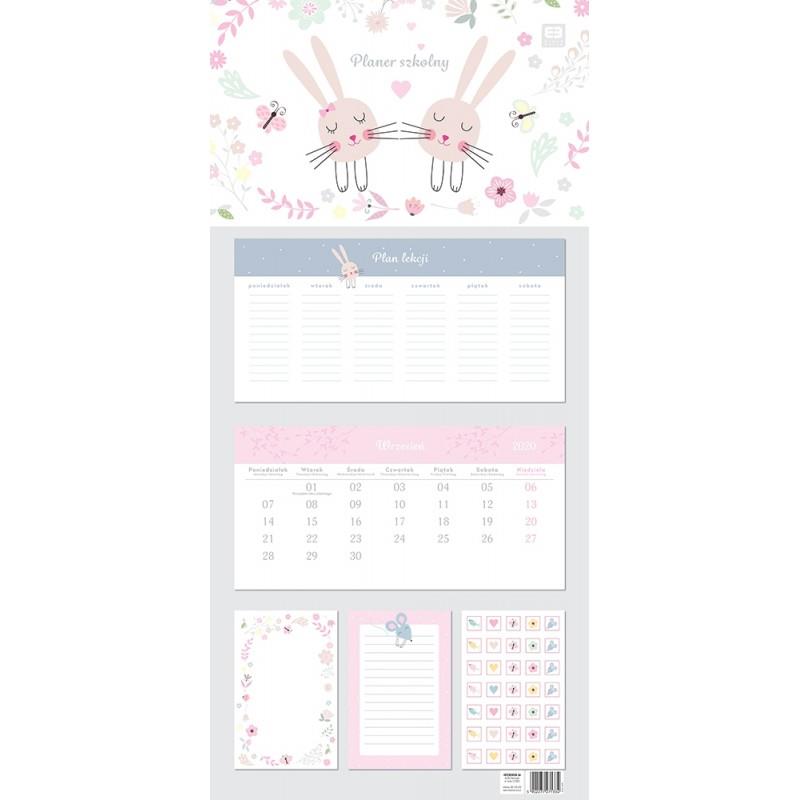 Planer szkolny dla dziewczynki z kalendarzem na rok szkolny 2020/2021 o wymiarach 320x675cm. Doskonały planer dla dzieci ułatwiający organizowanie nauki. Planer do zawieszenia na ścianie. Planer w pastelowych kolorach z motywem królików.