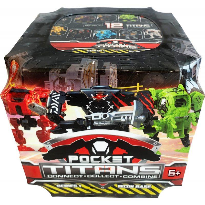 Pocket Titans to kolekcja 12 robotów ukrytych w sześcianie. Zbuduj własnego robota, poprowadź swoją armię tytanów do walki, pokonaj wrogów i wygraj ich kostki! Elementy sześcianu stają się modułową platformą do zabawy, którą można rozbudowywać elementami znajdującymi się w każdym sześcianie aby stworzyć ostateczną bazę dowodzenia. Strona każdej kostki jest kompatybilna z drugą, co pozwala dziecku na kreatywność i samodzielne budowanie. Każdy produkt zawiera: 20 sztuk modułowego zestawu do zabawy, 1 modułowego robota do złożenia (26 elementów), broń bojową.