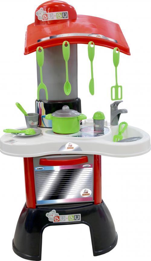 Zestaw BU-BU Nr 1 wyposażony jest w otwierany piekarnik, zlewozmywak z kranem, imitację dwóch płyt indukcyjnych oraz okap z haczykami na niezbędne narzędzia. Oprócz tego posiada komplet akcesoriów takich jak: garnek z pokrywką, pojemnik na przyprawy, kubek, talerzyki oraz sztućce (te mniejsze do spożywania posiłków, a także większe do ich przyrządzania). Egzemplarze powystawowe- opakowania mogą zawierać rozdarcia, przybrudzenia, rysy.