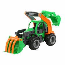 Traktor-ładowarka z łyżką GRIPTRUCK wyposażony jest w cztery szerokie koła ułatwiające jazdę po różnego typu nawierzchniach. Na przedniej części pojazdu umieszczono łyżkę z chwytakiem. Sama łyżka jak i jej ramię są ruchome, co umożliwia precyzyjne nabieranie materiału. Na części tylniej umieszczono mniejszą łyżkę, której ramię obraca się wokół własnej osi. Traktor wyposażono w dużą rączkę, która pomoże dziecku w transportowaniu pojazdu. Drzwi pojazdu można otwierać. W kabinie kierowcy znajdzie się miejsce na niewielką figurkę ulubionego bohatera.