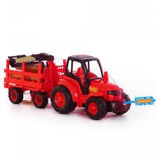 Traktor z przyczepą do przewozu dłużyc MISTRZ to klasyczny pojazd na czterech szerokich, dużych kołach. Ich struktura jest nierówna, by mógł pokonywać różne rodzaje podłoża. Kabina traktorzysty jest przestronna. Z pewnością zmieści się w niej figurka ulubionego bohatera. Do traktora dołączono przyczepę, na której jest miejsce do przewozu drewnianych kłód (dołączonych do zestawu). Jest również obrotowy, rozkładany chwytak na długim ramieniu umożliwiający transportowanie dłużyc z i na pojazd.