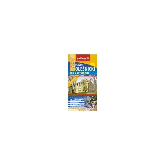 Mapa powiatu oleśnickiego,  w skład którego wchodzą gminy: Oleśnica, Twardogóra, Międzybórz, Bierutów, Dziadowa Kłoda, Syców oraz Dobroszyce. Na mapie zaznaczono miejscowości, drogi, lokalizację nowopowstającej autostrady, zabytki, ważniejsze noclegi, łowiska, stadniny koni oraz kąpieliska i baseny. Szczególnie atrakcyjne miejsca zaznaczono żółtą ramką. Podano aktualne przebiegi szlaków pieszych, rowerowych i kajakowych, łącznie z kilometrażem, co pozwala łatwiej zaplanować wycieczkę. Wskazano miejsca, gdzie można aktywnie spędzić wolny czas.