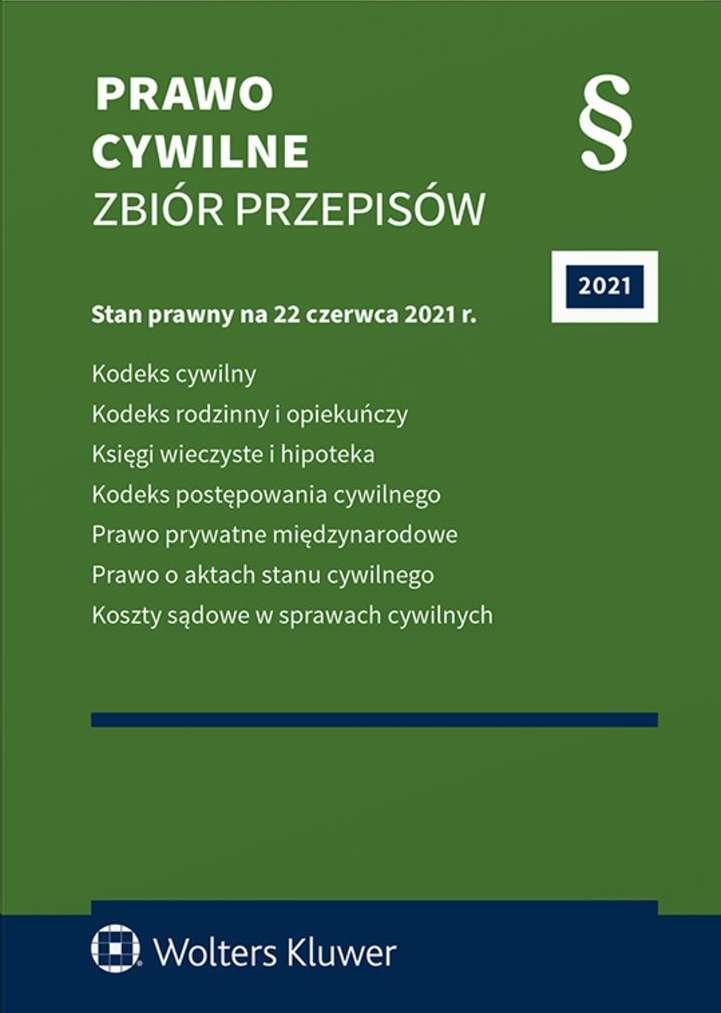 Stan prawny na 22.06.2021Uwzględnia zmiany wchodzące w życie z dniem:Kodeks cywilny: 5 października 2021 r. – ustawa z 18 listopada 2020 r. o doręczeniach elektronicznych (Dz.U. poz. 2320 ze zm.)Księgi wieczyste i hipoteka: po upływie 12 miesięcy od dnia ogłoszenia – ustawa z 20 maja 2021 r. o ochronie praw nabywcy lokalu mieszkalnego lub domu jednorodzinnego oraz Deweloperskim Funduszu Gwarancyjnym (oczekuje na opublikowanie w Dzienniku Ustaw RP)Kodeks postępowania cywilnego: • 1 lipca 2021 r., 1 grudnia 2021 r. – ustawa z 26 stycznia 2018 r. o zmianie ustawy o Krajowym Rejestrze Sądowym oraz niektórych innych ustaw (Dz.U. poz. 398 ze zm.),• 1 lipca 2021 r. - ustawa z 19 lipca 2019 r. o zmianie ustawy – Kodeks spółek handlowych oraz niektórych innych ustaw (Dz.U. poz. 1655 ze zm.),• 3 lipca 2021 r., 19 września 2021 r. - ustawa z 28 maja 2021 r. o zmianie ustawy – Kodeks postępowania cywilnego oraz niektórych innych ustaw (Dz.U. poz. 1090),• 30 października 2021 r. – ustawa z 11 września 2019 r. o zmianie ustawy o postępowaniu egzekucyjnym w administracji oraz niektórych innych ustaw (Dz.U. poz. 2070 ze zm.),• 1 grudnia 2021 r. – ustawa z 6 grudnia 2018 r. o Krajowym Rejestrze Zadłużonych (Dz.U. z 2019 r. poz. 55 ze zm.),• 1 października 2022 r. – ustawa z 18 listopada 2020 r. o doręczeniach elektronicznych (Dz.U. poz. 2320 ze zm.),• 18 kwietnia 2026 r. – ustawa z 5 sierpnia 2015 r. o zmianie ustawy o ochronie konkurencji i konsumentów oraz niektórych innych ustaw (Dz.U. poz.1634),• po upływie 12 miesięcy od dnia ogłoszenia – ustawa z 20 maja 2021 r. o ochronie praw nabywcy lokalu mieszkalnego lub domu jednorodzinnego oraz Deweloperskim Funduszu Gwarancyjnym (oczekuje na opublikowanie w Dzienniku Ustaw RP).Prawo o aktach stanu cywilnego: • 16 kwietnia 2021 r. – obwieszczenie Marszałka Sejmu Rzeczypospolitej Polskiej z 16 marca 2021 r. w sprawie ogłoszenia jednolitego tekstu ustawy – Prawo o aktach stanu cywilnego (Dz.U. poz. 709),• 5 października 2021 r., 1 stycznia 2023 r. – ustawa z 18 listopada 2020 r. o doręczeniach elektronicznych (Dz.U. poz. 2320 ze zm.).Koszty sądowe w sprawach cywilnych:• 1 lipca 2021 r. – ustawa z 19 lipca 2019 r. o zmianie ustawy – Kodeks spółek handlowych oraz niektórych innych ustaw (Dz.U. poz. 1655 ze zm.),• 1 grudnia 2021 r. – ustawa z 26 stycznia 2018 r. o zmianie ustawy o Krajowym Rejestrze Sądowym oraz niektórych innych ustaw (Dz.U. poz. 398 ze zm.),• 1 grudnia 2021 r. – ustawa z 28 maja 2021 r. o zmianie ustawy o Krajowym Rejestrze Zadłużonych oraz niektórych innych ustaw (Dz.U. poz. 1080),oraz 1 lipca 2021 r. – rozporządzenie Ministra Sprawiedliwości z 17 marca 2021 r. zmieniające rozporządzenie w sprawie maksymalnych stawek taksy notarialnej (Dz.U. poz. 516).