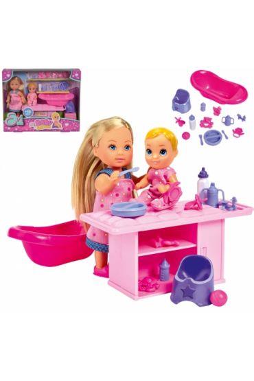 Laleczka Evi jako opiekunka niemowlaka ma do dyspozycji stolik do przewijania, nocnik, wanienkę i wiele akcesoriów do pielęgnacji. Wysokość lalki: 12 cm Wymiary opakowania: 16 x 20 x 6 cm Dla dzieci w wieku: 3+