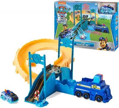 Psi Patrol zestaw Chase Rescue Set Zestaw został stworzony przez docenianą za jakość produktów mark Spin Master Zestaw ten powstał na podstawie animowanego serialu dla dzieci od tytułem Psi Patrol (ang Paw Patrol) i pochodzi z serii zabawek Ultimate Rescue Zestaw ten zawiera wyjątkowy otwierany most znajdujący si na trasie Chase a Dzielny piesek wybiera si na nastpną misj Zaczyna swoją podróż na wyrzutni umieszczonej na zaparkowanym dużym samochodzie ratunkowym przemierza drog przez zepsuty most i wyjeżdża obok koła ratunkowegoDuży pojazd ratunkowy może służyć osobno do wypełnienia misji a także jako wyrzutnia Zepsuty most można otworzyć i zamknąć by umożliwić pieskowy przejazd niewielkim pojazdem z figurką przez ptlChase to odważny owczarek niemiecki W bajce policjantem i liderem grupy Jest ubrany jest w charakterystyczny niebiesko-żółty strój Ma na głowie niebieską czapk z daszkiem a na grzbiecie odrzutowy plecak