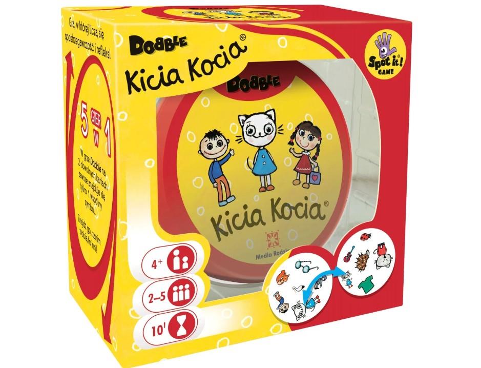 Kicia Kocia, bohaterka popularnych książek dla dzieci, wraz z przyjaciółmi zawitała do świata gier! Na co dzień uczą maluchy, jak zachowywać się w codziennych sytuacjach, a teraz będą wspierać je w ćwiczeniu spostrzegawczości i refleksu podczas szukania par identycznych symboli. Zadanie jest proste: spójrz na pierwszą kartę, którą trzymasz w ręku oraz na tę, która leży na środku stołu. Znajdź na nich wspólny symbol, nazwij go i szybko pozbądź się swojej karty. Teraz następna! Tylko nie zwątp, dwie dowolne karty zawsze łączy jeden wspólny obrazek. W Dobble można grać na wiele sposobów, a 5 z nich jest opisanych w instrukcji jako mini-gry. Aby utrudnić zabawę symbole na kartach bywają odwrócone i miewają różne rozmiary. Same karty są okrągłe i kolorowe, a każda z nich ma unikalny zestaw symboli związanych z postaciami z książeczek o Kici Koci.