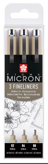 Zestaw trzech, japońskich cienkopisów sakura Pigma Micron o grubościach 02, 04 i 08. Cienkopisy umożliwiają precyzyjne kreślenie linii. Opatentowany przez marke Sakura tusz Pigma jest stabilny chemicznie, wodoodporny i nie rozmywa się. Cienkopisy Pigma Micron stworzone zostały z myślą o projektantach, architektach, naukowcach, rysownikach komiksów i mangi, ilustratorów i hobbystów.