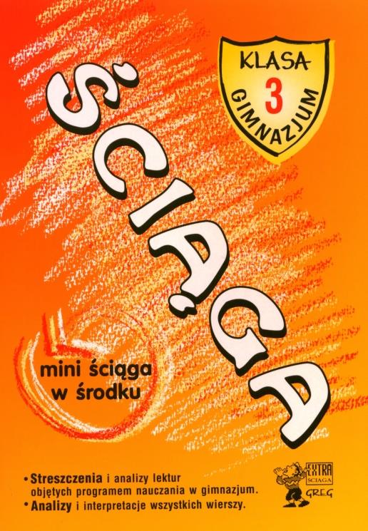 Seria Ściąga - w każdej książce zaprezentowano zestaw wierszy i lektur najczęściej omawianych w szkole. To, co wyróżnia Ściągę, to rozbudowane i szczegółowe streszczenia. Dopracowano także charakterystyki bohaterów, żeby każdy, kto niechętnie czyta lektury, miał tu bogaty asortyment informacji wymaganych przez nauczycieli.Tu uczniowie mają do dyspozycji teksty, których, w zależności od wymagań polonistki, mogą się nauczyć na pamięć, wykorzystać do powtórek w domu i tuż przed lekcją, potraktować jako pomoc w trakcie odrabiania zadań domowych, pisania wypracowań, formułowania wypowiedzi ustnych.Najnowsze wydanie Ściągi to niezastąpiony towarzysz uczniów na lekcji i w domu. Jej jakość merytoryczną potwierdziło już kilka pokoleń czytelników.