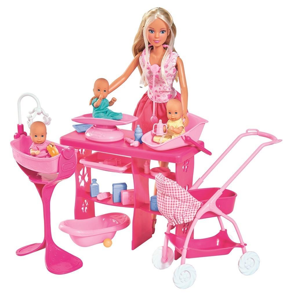 Zestaw Opiekunka trojaczków pozwoli dziewczynkom sprawdzić si w roli opiekunki do dziecka razem ze Steffi i dołączonymi akcesoriami dla dzieci ? idealnymi do odegrania klasycznych scenek Lalka z długimi blond włosami ubrana jest w sukienk biała góra z motywem serc i różowy dół oraz różowe sandałki na obcasie Steffi jako profesjonalna opiekunka trzech noworodków ubranych w kolorowe śpioszki ma do dyspozycji przewijak z półkami na akcesoria oraz wag wózek z gondolką nosidełko wanienk i kołysk z karuzelą Dodatkowo zestaw uzupełniają podstawowe przybory do opieki min butelka do karmienia kubek niekapek talerzyk ze sztućcami smoczek gryzak małe zabawki stetoskop tacka na przyrządy medyczne strzykawka termometr pojemniczki z lekami i inne