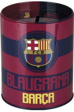 Metalowa skarbonka FC-109 FC Barcelona z kolorowym nadrukiem FCB, wykonana z lakierowanego materiału.