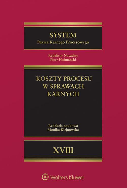 System Prawa Karnego Procesowego to wielotomowe wydawnictwo opracowane pod redakcją merytoryczną Piotra Hofmańskiego. Jest to jedyne na rynku tak aktualne, obszerne i kompleksowe omówienie całego systemu instytucji polskiego prawa karnego procesowego. System stanowi fundamentalne teoretyczne opracowanie problemów tej dziedziny prawa z uwzględnieniem wszystkich perspektyw patrzenia na poszczególne instytucje procedury karnej.W tomie XVIII Systemu scharakteryzowano koszty procesu karnego nie tylko od strony teoretycznej poprzez wskazanie ponadczasowych zasad, dorobku doktryny polskiego procesu karnego i orzecznictwa, lecz także z zaznaczeniem kwestii praktycznych, takich jak chociażby sposób obliczania danych kosztów. Systematyka omówionych zagadnień została zdeterminowana przez podział kosztów narzucony przez Kodeks postępowania karnego, a zarazem dostosowana do struktury procesu karnego: najpierw poruszono zagadnienia o charakterze ogólnym, statycznym, kwestie wspólne dla rozstrzygania o kosztach procesu (rozdz. 1-6), następnie opisano koszty w dynamice procesowej, czyli tryb rozstrzygania o nich oraz reguły ich rozdziału w postępowaniu karnym (rozdz. 7-19).