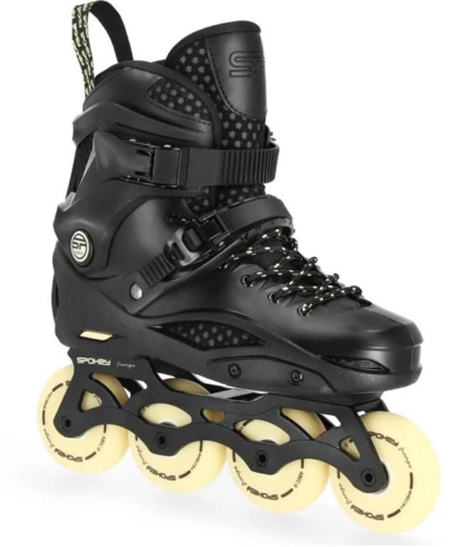 Rolki Spokey FREESPO to połączenie komfortu jazdy oraz najlepszych parametrów technicznych. Zastosowanie twardej skorupy, wykonanej z PP* (wysoce elastyczny polipropylen), zapinanej na dwie klamry (górną klasyczną oraz dolną z pompką zaciskową) oraz sznurowadła, zapewnia optymalne dopasowanie buta do stopy. Zmniejsza to ryzyko doznania kontuzji i jednocześnie umożliwia perfekcyjne kontrolowanie manewrów i skrętów podczas jazdy. Konstrukcja Freespo niweluje także błędy, które często pojawiają się u początkujących skaterów, takie jak np. koślawienie kostek. Twarda skorupa z wyciąganą, świetnie wentylującą wkładką z materiału piankowego w kształcie plastra miodu  Potrójne zapięcie na dwie klamry i sznurowadła. Pozwala to na optymalne dopasowanie buta do stopy oraz zapewnia bezpieczeństwo przy szybkiej jeździe slalomowej, miejskiej i freeskatowej! Aluminiowa płoza, wycinaną techniką CNC, co zapewnia maksymalną trwałość i wytrzymałość, Wysokiej klasy łożyska ABEC9 Chrome, Rolka wszechstronna, dedykowana zarówno do szybkiej, dynamicznej jazdy freestylowej i rekreacyjnej, ale także do rozpoczęcia przygody ze skatingiem, przy jednoczesnym zachowaniu bezpieczeństwa, dzięki doskonałym parametrom technicznym.