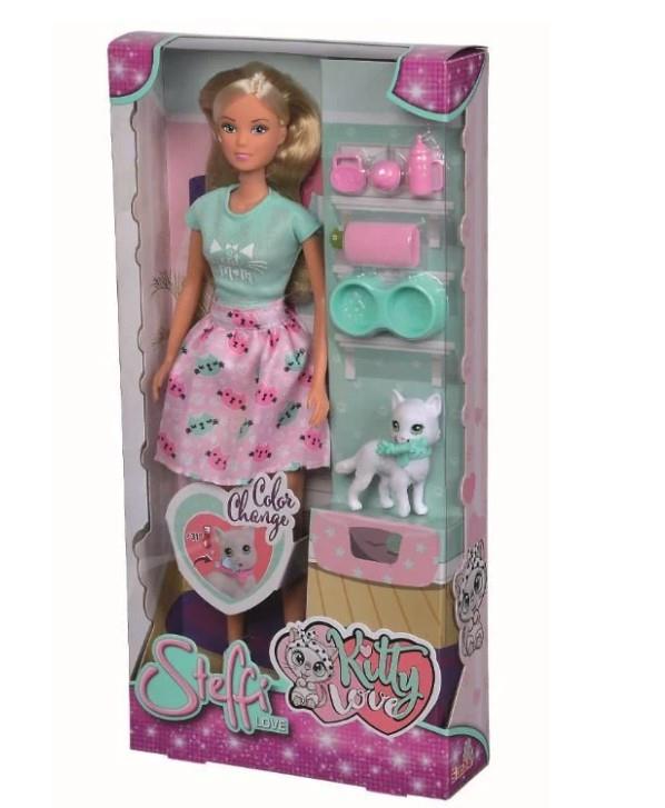 Steffi opiekuje się kotkiem, jej strój jest dopasowany do charakteru pupila. Kociak ma brudny pyszczek, można go wyczyścić pocierając namoczoną w ciepłej wodzie dołączoną ściereczką - reaguje na zmianę temperatury, dołączone akcesoria do pielęgnacji i zabawy.