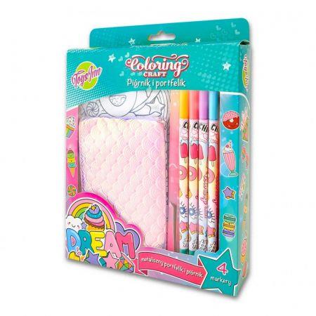 Zestaw do kolorowania z piórnikiem i portfelikiem. Portfelik i piórnik z jednej strony wtkończone modnym, różowym i błyszczącym materiałem. Z drugiej strony portfelika/piórnika znajduje się rysunek z diamentowym wzorem do pokolorowania. W zestawie cztery markery do materiałów. Wymiary piórnika: 19x10 cm Wymiary portfela: 14 x 9 cm Wymiary opakowania: 17,5 x 23,5 x 4 cm.