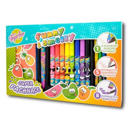 Zestaw pachnących mazaków. W pudełku znajduje się: jeden 10-kolorowy długopis pachnący, 2 arkusze pachnących naklejek, 5 pachnących długopisów żelowych oraz 8 pachnących markerów. Kolory (zapachy) pisaków: żółty (banan), zielony (jabłko), niebieski (jagoda), różowy (arbuz) i czerwony (truskawka). Komplet zachęca dziecko do malowania i pisania, ponieważ może ono powąchać wszystko to, co napisało i namalowało. Owocowe zapachy pobudzają wszystkie zmysły. Zabawka pozwala na ćwiczenie kreatywności i rozwija zmysł artystyczny. Wymiary opakowania: 22x36x5cm Wiek: 3+