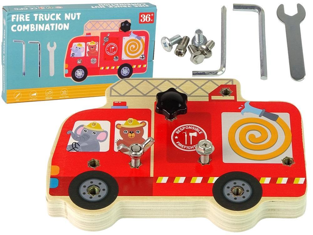 Drewniana Straż Pożarna Do Skręcania Wkręcanie Śrub Śrubek Straż pożarna to pojazd, który w rzeczywistości ratuje ludzi z pożarów lub innych niebezpiecznych sytuacji. Teraz mały kierowca może stać się małym majsterkowiczem i naprawić uszkodzony wóz, aby bezpiecznie dojechał na akcję ratowniczą. W drewnianym wozie strażackim znajdują się specjalne otwory z nakrętkami. Zadaniem Twojego dziecka jest przykręcenie śrub za pomocą odpowiednich narzędzi. Każda ze śrubek ma inną główkę, więc nie jest tak prosto. Należy dobrać pasujące narzędzie i rozpocząć przykręcanie. Do dyspozycji są nimbusy, klucze, śrubki z różnymi zakończeniami. Sprawdź swoje siły w majsterkowaniu! Cały zestaw rozwinie u Twojego dziecka zdolności manualne, wyobraźnie przestrzenna oraz pomoże rozpoznawać i dobierać odpowiednie narzędzia. Zabawka wykonana jest z wysokiej jakości drewna, a wszystkie elementy zostały dokładnie oszlifowane i pomalowane na żywe kolory bezpiecznymi farbami. Zabawki drewniane są wyjątkowo trwałe i odporne na uszkodzenia, dzięki czemu posłużą latami w nienaruszonym stanie. Elementy zestawu: - drewniana straż pożarna - nimbusy - śrubki (motylek, imbusowa) Wymiary straży: 18 cm x 13 cm x 2 cm Wymiary opakowania: 23 cm x 14 cm x 3 cm Drewniana zabawka przeznaczona jest dla wszystkich dzieci powyżej 3 roku życia. Zabawka posiada certyfikat CE, a jej produkcja jest zgodna z obowiązującą normą EN 71.