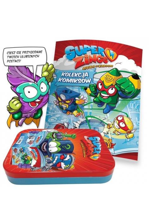 W kolekcjonerskiej, kolorowej puszce Super Zings znajduje się książka z pełnymi akcji komiksami, których bohaterami są Superbohaterowie i Złoczyńcy z Kaboom City. Oprócz tego w zestawie znajduje się peleryna Super Zings oraz magnes z jedną z rzadkich postaci. Puszka doskonale nadaje się do przechowywania figurek Super Zings!
