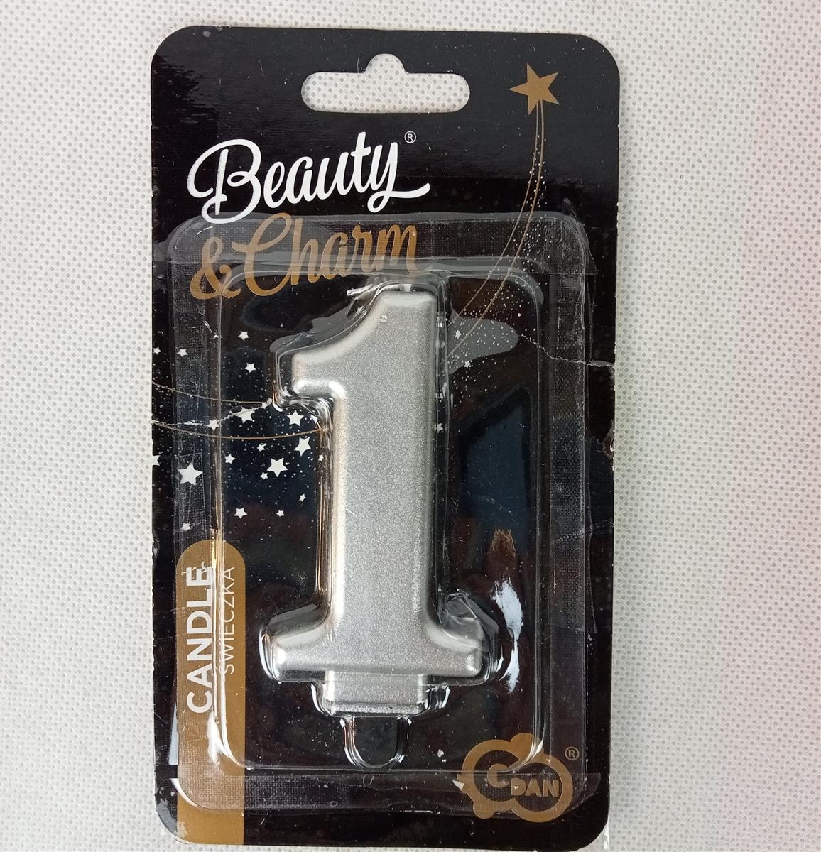 świeczka wzór: cyfra 1 kolor: metalik srebrny wysokość: 8 cm liczba sztuk w opakowaniu: 1 Produkt może mieć uszkodzone opakowanie lub naruszoną plombę fabryczną opakowania.