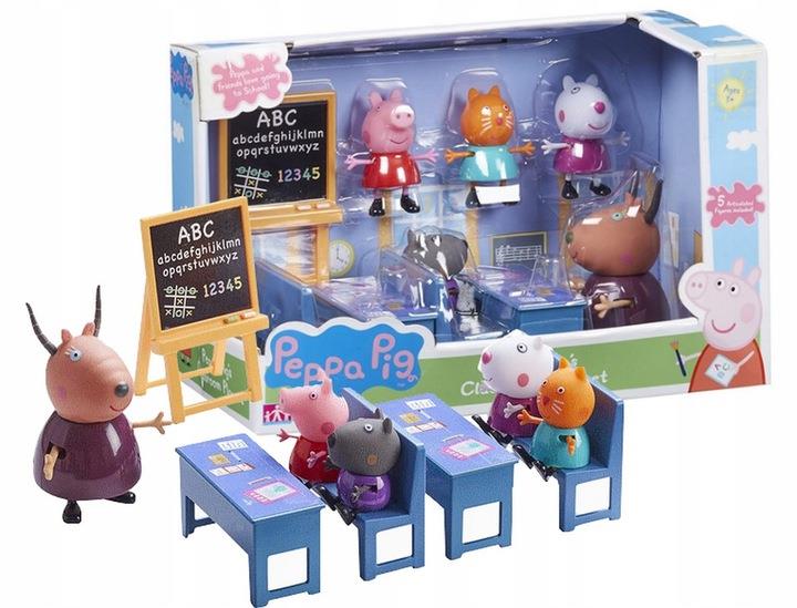 W klasie Świnki Peppy znajdują się 2 biurka i krzesła, tablica oraz 5 figurek: Peppa, 3 szkolne koleżanki i jej nauczycielka Madame Gazelle!