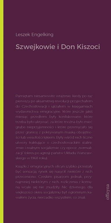 Książka wytrawnego tłumacza, znawcy literatury i pisarza Leszka Engelkinga Szwejkowie i Don Kichoci to krytycznoliteracka panorama wybranych dzieł i nurtów literatury czeskiej XX oraz XXI wieku. Nie pretenduje ona ani do przedstawienia pełni obrazu czeskiego piśmiennictwa tych czasów, ani do ferowania ostatecznych wyroków dotyczących wartości i wagi poszczególnych dzieł i tendencji, próbuje natomiast przedstawić wizję niektórych trendów i analizy konkretnych utworów, wskazać na zjawiska do tej pory u nas słabo znane i rewidować stereotypy często decydujące o sposobie prezentacji tej literatury w naszym kraju. Książka Engelkinga dostarcza wiedzy o wielu faktach związanych ze współczesną kulturą czeską i jej polską recepcją i poszerza horyzonty zainteresowanych nią czytelników, pozwalając lepiej orientować się w bogatej i różnorodnej materii przede wszystkim literackiej. Egzemplarze powystawowe - mogą zawierać zbite rogi, rozdarcia, przybrudzenia,rysy.