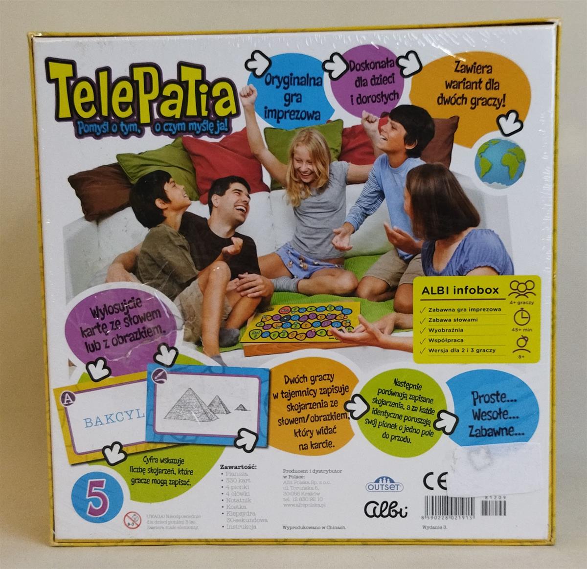 Gra Telepatia to świetny sposób na urozmaicenie spotkania towarzyskiego czy rodzinnego. Jest to interesująca gra, w której główną rolę odgrywają twoje... skojarzenia. Gracze dopisują do wylosowanego słowa lub obrazka skojarzenia, następnie je porównują i poruszają się pionkiem na planszy o tyle pól, ile było wspólnych skojarzeń.