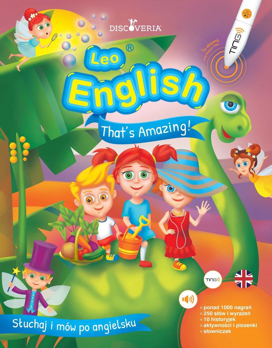 Książka dla dzieci z serii „Ting. Leo English” to świetna zabawa, podczas której dziecko wspólnie z bohaterami uczestnicząc w różnych przygodach, poznaje i utrwala słowa oraz całe wyrażenia w języku angielskim.Stosując długopis „Ting”, dziecko ma możliwość nie tylko osłuchania się z materiałem leksykalnym, również dzięki efektom dźwiękowym spójnym z treścią historyjki poznaje pełen kontekst użycia właściwych treści językowych w danej sytuacji. Aktywnie uczestnicząc w odkrywaniu przygód bohaterów w naturalny sposób odczuwa potrzebę komunikowania się po angielsku poprzez odpowiedzi na pytania, wydawanie poleceń i zgadywanie.„Ting” to również gwarancja prawidłowej wymowy, co daje świetną możliwość także rodzicom, którzy nie znają języka angielskiego. Historyjki prezentowane są w formie dźwiękowej z bogatą oprawą muzyczną. Do utrwalania treści językowych wykorzystane są piosenki, rymowanki, zagadki oraz ćwiczenia słuchowe.