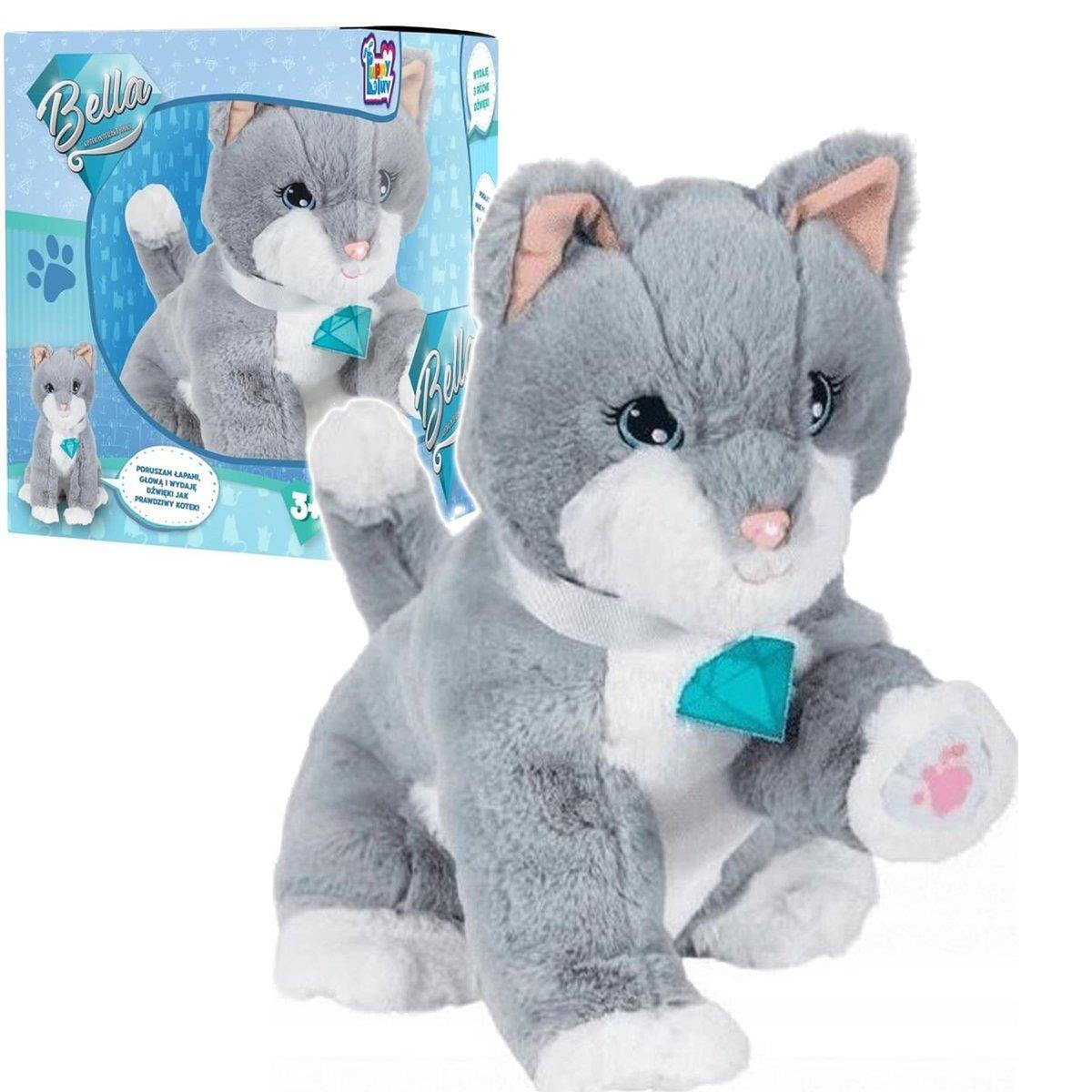 Bella to przyjazny kotek, który tylko czeka na zabawę z Tobą. Pokryty pluszem kotek, miauczy radośnie i mruczy. Pod brodą ma uroczą obrożę. Sympatyczny pupil posiada aż 12 funkcji, dzięki czemu urozmaici dziecku zabawę, wspólnie przeżyją niezapomniane przygody i przeniosą się do świata wyobraźni. Interaktywna maskotka zachowuje się jak prawdziwy kot.