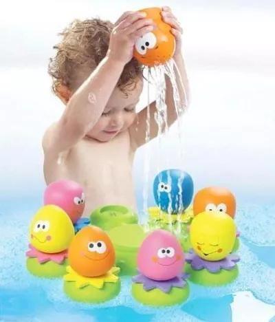 Zestaw zapewnia wspaniałą zabaw podczas kąpieli! Wszystkie ośmiorniczki tworzą wysp unoszącą si na wodzie Można odczepić dużą ośmiorniczk zacząć nalewać i wylewać z niej wod Mniejsze ośmiorniczki mogą nurkować i tryskać wodą