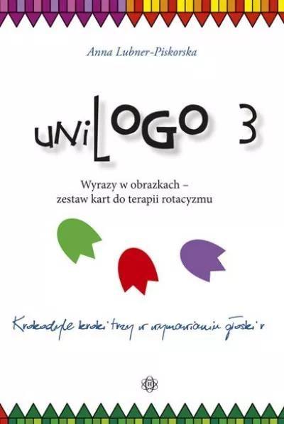 UniLogo 3 to zestaw 470 wyrazów w obrazkach, kart pracy i tekstów (wierszy, zagadek itp.) przeznaczonych do terapii logopedycznej rotacyzmu. Teczka Wyrazy w obrazkach zawiera 470 ilustracji przedmiotów, w których nazwie występuje głoska r, wraz z podpisami. Karty są przygotowane tak, by po pocięciu na jednej stronie znajdował się obrazek, a na drugiej podpisy do niego. Karty można też powielić tak, by obrazki i podpisy były osobno. W teczce znajdują się również materiały do badania słuchu fonemowego ? są 24 karty z ilustracjami par przedmiotów pomocne w próbie zdiagnozowania przyczyn rotacyzmu i określenia jego rodzaju.