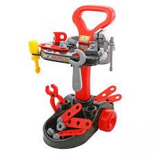 Zestaw składa się przede wszystkim ze specjalnego wózka wyposażonego w dwa szerokie koła, które gwarantują mu stabilność, na dole półkę i niewielki pojemnik do przechowywania narzędzi, u góry blat i kolejny pojemnik umocowany przy wygodnej rączce do pchania. Przy blacie umieszono uchwyty np. na śrubokręt i klucz francuski.