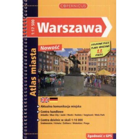 Nowy, uaktualniony Atlas Miasta Warszawy w skali 1:17 500 został opracowany w pełnych granicach administracyjnych, z wykorzystaniem najnowszych informacji z terenu. Stanowi on kompletną, rzetelną i aktualną informację o stolicy Polski. Plan Warszawy zawiera szczegółowy rysunek ulic, osiedli, linii kolejowych, autobusowych, tramwajowych oraz linię metra, a także zabudowy. zaznaczono elementy organizacji ruchu takie jak: sygnalizacja świetlna, ulice jednokierunkowe oraz ulice tylko dla pieszych czy wysokości wiaduktów. Na mapie wyróżnione zostały budynki użyteczności publicznej, obiekty zabytkowe, tereny przemysłowe, parki, cmentarze. zawarte zostały również szlaki turystyczne, turystyczne rowerowe, ścieżki rowerowe czy granice parków krajobrazowych. Na treść informacyjną składają się obiekty związane z kulturą, ważniejsze urzędy i instytucje, baza noclegowa, punkty ochrony zdrowia oraz inne interesujące obiekty. Dodatkowo w atlasie umieszczona jest mapa okolic Warszawy w skali 1:300 000 oraz mapki: centrum miasta, Starej Ochoty, Starego Mokotowa, Starego Żoliborza i Starej Pragi w skali 1:10 000. Ponadto zamieszczone zostały plany centrów handlowych: Reduta, Blue City, Wola Park, Arkadia, Marki, Targówek, wykaz linii komunikacji miejskiej oraz skorowidz ulic. Ciekawostką są plany adresowe Kolorowe Ulice wybranych osiedli mieszkaniowych (Chomiczówka, Wawrzyszew, Bemowo, Jelonki, Tarchomin, Nowodwory, Marymont, Bródno, Targówek, Os. Ostrobramska, Gocław, Stegny, Służew, Służewiec, Ursynów, Natolin, Ursus-Niedźwiadek, Włochy-Solipse, Wrzeciono, Wierzbno). Legenda napisana jest w trzech językach: polskim, angielskim i niemieckim. Atlas ten umożliwia również współpracę z systemem GPS. Rok wydania: 2008,