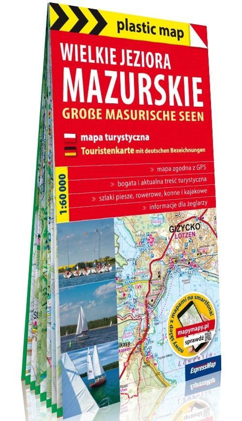 Dwustronnie foliowana, trwała mapa turystyczna Krainy Wielkich Jezior Mazurskich obejmuje obszar od Węgorzewa na północy po Jezioro Nidzkie na południu. Publikacja została opracowana we współpracy z doświadczonymi krajoznawcami z regionu. Cechy mapy: - dogodna zarówno dla pieszego, rowerzysty, jak i żeglarza, skala 1:60 000 (1 cm 600 m), - bogata treść turystyczna, - zgodność z GPS współrzędne geograficzne w układzie WGS-84 Na mapie m.in.: - szlaki piesze i rowerowe, szlaki kajakowe, szlaki żeglugi pasażerskiej, - baza noclegowa, w tym hotele, kempingi, stanice wodne, - treść żeglarska, w tym głębokości jezior, przeszkody i mielizny, przystanie i pomosty, slipy i dźwigi, warsztaty szkutnicze, - muzea, zabytki, bunkry i inne interesujące obiekty, - parki krajobrazowe, rezerwaty przyrody, atrakcje przyrodnicze, - niemieckie nazwy (miejscowości, jezior, rzek, itp.) sprzed II wojny światowej, niemieckie współczesne opisy obiektów - poziomice i cieniowanie pokazujące ukształtowanie terenu.