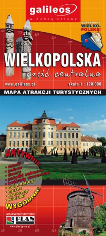 Mapa turystyczna centralnej części województwa wielkopolskiego z opisem krajoznawczym i licznymi zdjęciami najważniejszych obiektów na mapie. Aktualizowana w terenie mapa zawiera niezbędne informatory krajoznawcze najważniejszych atrakcji turystycznych regionu, wyróżnionych dodatkowo na mapie graficznymi ikonami. Mapa ma układ pionowy.
