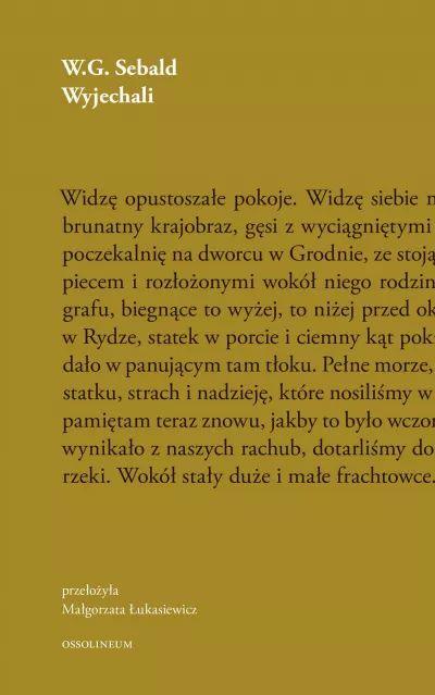 Niezwykła książka urodzonego pod koniec wojny znakomitego niemieckiego pisarza początkowo sprawia wrażenie niemal dokumentalnej relacji z życia czterech żydowskich wygnańców, zamieszkałych w Austrii, Anglii i Stanach Zjednoczonych wrażenie spotęgowane obecnością fotografii, listów i dzienników podróży. Jednak w miarę lektury czytelnik odkrywa, że ma do czynienia z oryginalnym, wielowymiarowym gatunkiem literackim, stworzonym, by jak najwnikliwiej zanurzyć się w przesość ludzi, którym Holokaust odebrał ojczyznę i tożsamość. Narrator Sebalda, wrażliwy słuchacz ich opowieści, podąża za nimi z Litwy do Londynu, z Monachium do Manchesteru, z południowych Niemiec do Francji, Nowego Jorku, Konstantynopola i Jerozolimy, zbierając materialne świadectwa istnienia w czasie i przestrzeni. Rozkłady jazdy, bilety do kina, autografy i pocztówki najbardziej przyziemny szczegół emanuje tajemniczym, niebezpiecznym znaczeniem i zarazem ewokuje utracony raj.