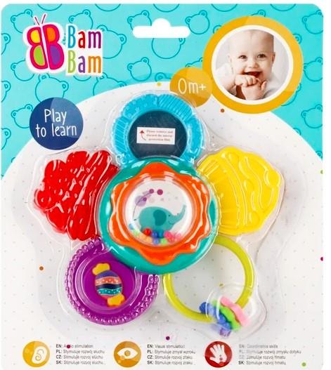 Zalety produktu: Kwiatuszek na przyssawkę BAM BAM zabawka edukacyjna przeznaczona dla maluchów od 0m . Kwiatuszek osadzony jest na obracającej się platformie. W wyniku obrotu platforma wydaje delikatne, turkocząco- grzechoczące dźwięki, dzięki kolorowym kuleczkom umieszonym w środku kwiatka. Płatki kwiatka o zróżnicowanej fakturze i wzorach, kolorach, które kręcąc się, absorbują uwagę dziecka aktywizując jego zmysły wzroku, dotyku, słuchu. Przyssawka osadzona pod zabawką zapewnia stabilne mocowanie do blatu stolika, tacki wózka czy krzeska do karmienia. Wymiary/waga/baterie: wymiary produktu szer. x wys. cm : 15x15 wymiary opakowania dł. x wys. x gł. cm : 20x24x8, waga produktu bez opakowania kg : 0,11 kg, waga produktu w opakowaniu kg : 0,15 kg, nie wymaga zasilania bateriami. Zabawka przeznaczona dla dzieci w wieku: 0m . Pakowana na blistrze.
