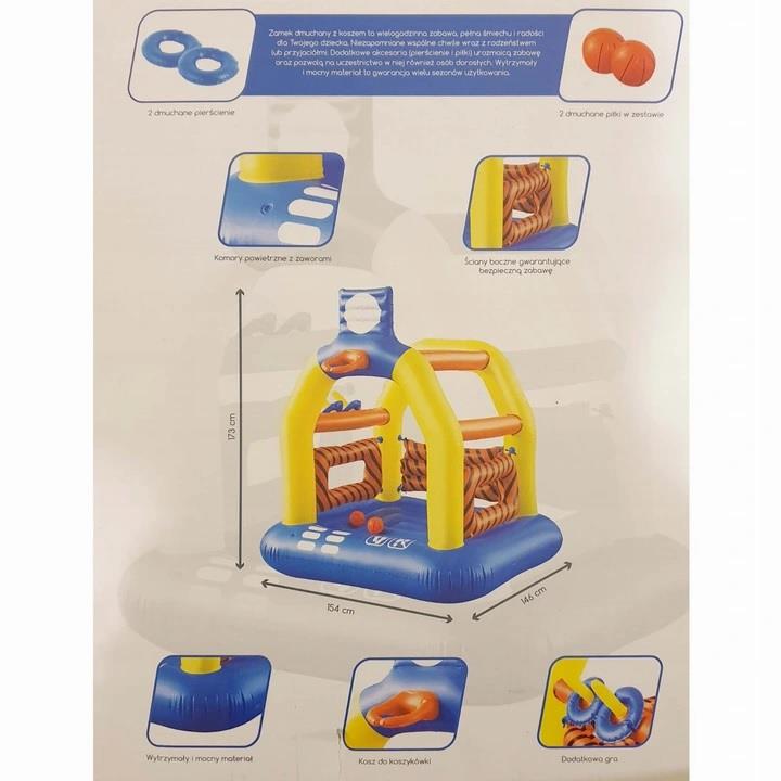 Zamek dmuchany z koszem to wielogodzinna zabawa, pełna śmiechu i radości dla Twojego dziecka. Niezapomniane wspólne chwile wraz z rodzeństwem i przyjaciółmi. Dodatkowe akcesoria (pierścienie i piłki) urozmaicą zabawę oraz pozwolą na uczestnictwo również osób dorosłych. Wytrzymały i mocny materiał to gwarancja wielu sezonów użytkowania.