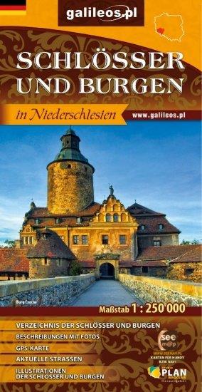 Niemieckojęzyczna wersja mapy „Zamki i pałace Dolnego Śląska” w skali 1:250 000.Naniesiono na niej wszystkie zamki, pałace, dwory (z podziałem na w dobrym stanie i zniszczone), wieże mieszkalne i twierdze. Zaznaczono również obiekty, które można zwiedzać i te, w których są hotele. Ponad 120 z nich przedstawiono za pomocą ilustracji. Na drugiej stronie umieszczono obszerny opis wybranych budowli w języku niemieckim (122 obiekty) wraz z fotografiami.Mapa zawiera:– spis zamków i pałaców– opisy z fotografiami– mapa zgodna z GPS– aktualne drogi– rysunki zamków i pałacówFormat 98.0 x 68.0 cm Wydanie 1, 2018