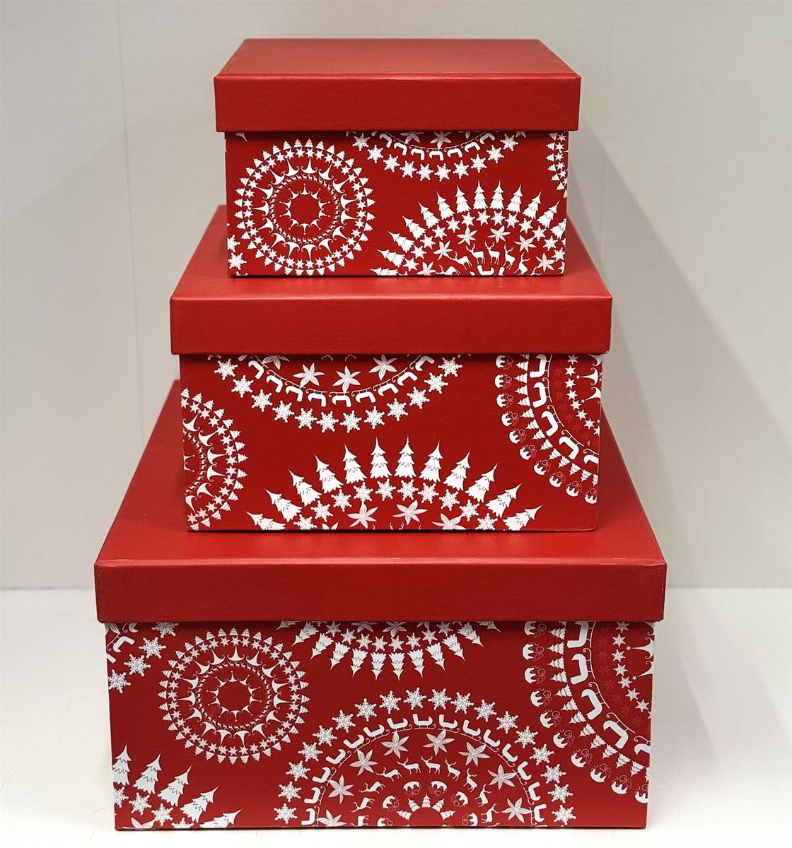 Zestaw 3 pudełek prezentowych Wymiary:* 21 cm x 21 cm x 12 cm * 16 cm x 16 cm x 9,5 cm * 13 cm x 13 cm x 7,5 cm