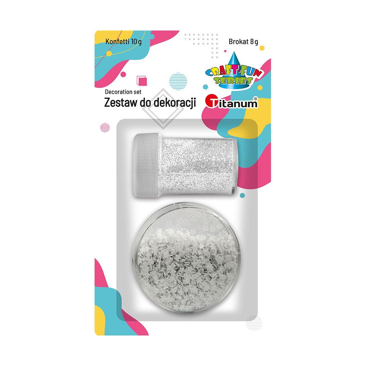 Zestaw zawiera: brokat i konfetti w kształcie gwiazdek. Kolor: biały. Waga: brokat 8 g, konfetti 10 g. Przezroczyste pojemniczki z zakrętką.